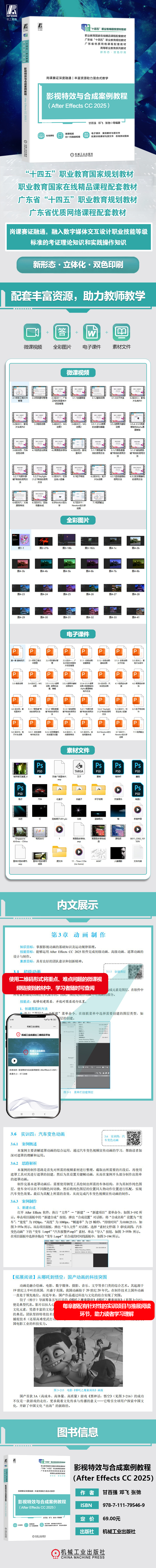 本书是“十四五”职业教育国家规划教材《After Effects CC 2018影视特效与合成案例教程》的修订版。在保留原有核心知识的基础上,以After Effects CC 2025为切入点,融入新的数字媒体技术知识,并通过精细化的图文呈现方式,进一步提高全书的可读性。 本书全面介绍了After Effects CC 2025的基本功能及项目制作全流程。主要内容包括基础知识、项目管理、动画制作、色彩调节、键控、特效合成和影片输出。 本书内容丰富、结构严谨、技术参考性强,非常适合After Effects爱好者学习,可作为高等职业院校数字媒体艺术与动画相关专业的教材,也可作为影视后期、栏目包装制作人员的参考用书。