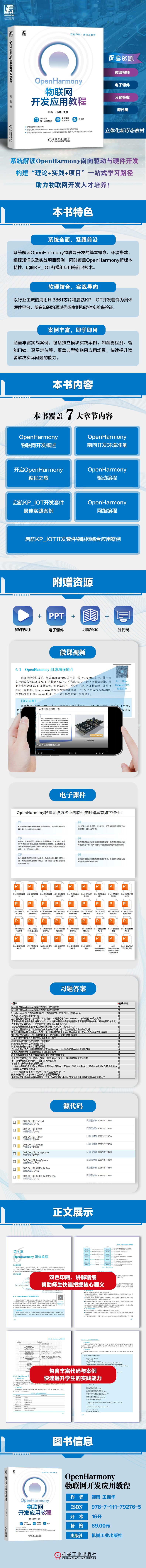 《OpenHarmony物联网开发应用教程》是一本全面介绍OpenHarmony物联网开发的教材。本书第一部分从OpenHarmony的基本概念出发,详细阐述了物联网的发展历程、核心特征和体系架构。通过深入讲解OpenHarmony的技术架构和目录结构,为读者提供了一个清晰的学习框架。本书第二部分则聚焦于OpenHarmony南向开发环境的搭建,包括详细介绍海思Hi3861芯片和启航KP_IOT开发套件,以及如何在不同操作系统上搭建开发环境。本书第三部分则深入探讨了OpenHarmony编程基础,包括内核编程和驱动编程,为读者提供了丰富的编程知识和实战案例。 在网络编程方面,本书详细介绍了Wi-Fi联网、TCP/IP网络编程,以及UDP和TCP客户端及服务器的实现,使读者能够掌握物联网设备联网的核心技术,并通过一个综合应用案例展示了如何将所学知识应用于实际项目中,实现从设备侧到平台侧的完整开发流程。通过学习本教材,读者能够掌握OpenHarmony物联网开发的核心技能,为未来的职业发展打下坚实的基础。 本书可作为高等院校计算机类、电子信息类专业学生教材,也可供从事OpenHarmony开发及移动互联网应用开发的相关技术人员参考。本书是新形态教材,配有电子课件、源代码文件、实验手册、讲解视频、教学大纲及习题库,需要的读者可登录www.cmpedu.com免费注册,审核通过后下载使用,或联系编辑索取(微信:18515977506,电话:010-88379753)。